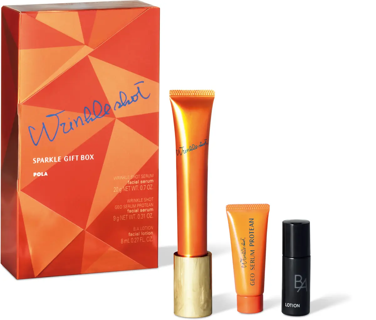 シワ改善美容液リンクルショット メディカルセラム N(医薬部外品*2)現品(20g)、ハリのある肌を目指す美容液リンクルショット ジオセラム プロティアン(医薬部外品*3・9g)、9月にリニューアルされたポーラ最高峰ラインの化粧水B.A ローション 7(8㎖)のセット。