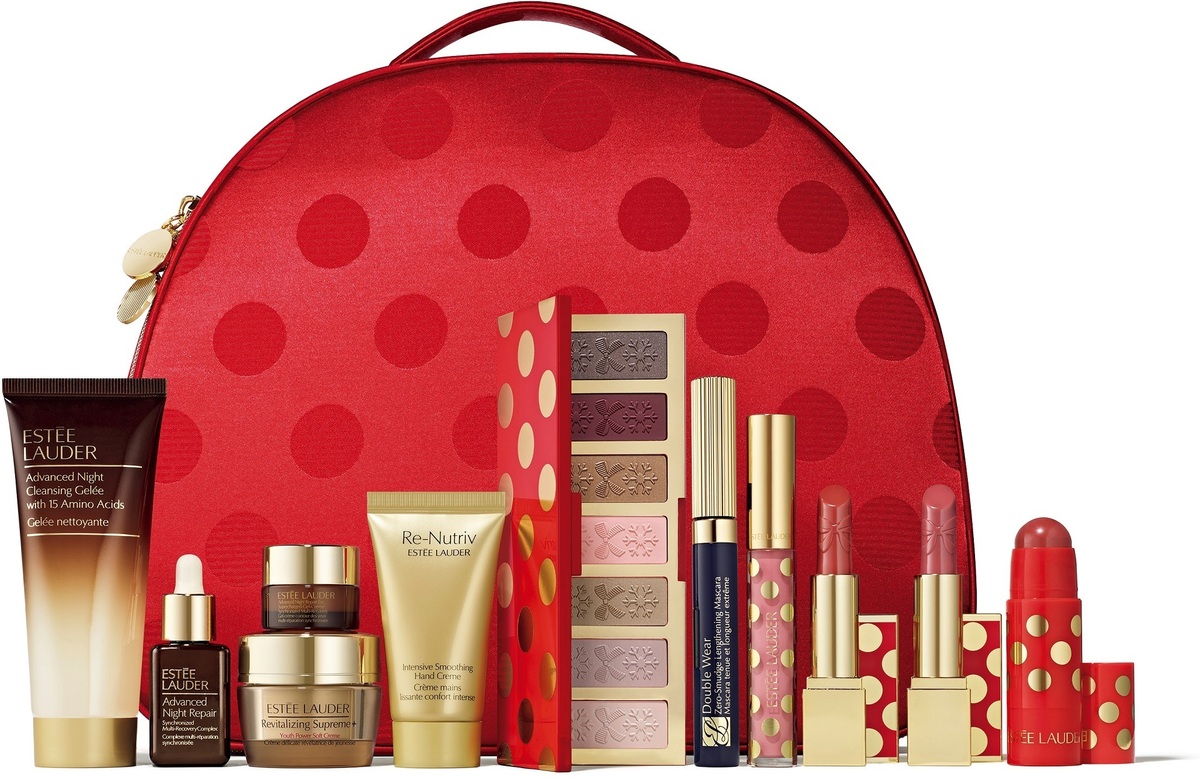 ホリデールックに仕上げるメイクアップアイテムと、エスティ ローダーが誇るベーシックスキンケアがセットになった1年に1度の特別コレクション。ロングセラー、限定カラーと、オールマイティーなラインアップに限定パッケージの水玉が気分を盛りあげてくれる。
