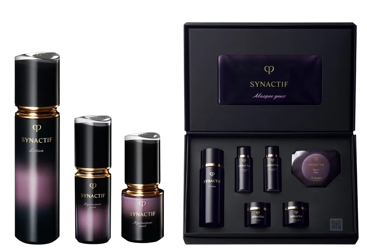 クレ・ド・ポー ボーテ最高峰のシナクティフのキット。保湿液(125㎖)、日中用美容液(20㎖/20g)、夜用美容液(40㎖)の現品に、特製サイズ7品[洗顔料(6g)、保湿液(30㎖)、日中用美容液(3㎖)、夜用美容液(5㎖)、クリーム(3g)、アイクリーム(3g)、アイマスク(1回分)]、コットン14枚付き*1
