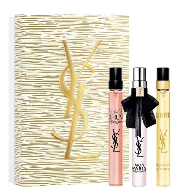 3つ香りを楽しめるミニ(10㎖)のセット。ブラック OP オーデパルファムは、甘さに深みがあり、秋冬におすすめの香り。モン パリ オーデパルファムは、甘くフェミニンなフローラルノート。ジェンダーレスなフローラルラベンダー、リブレ オーデパルファムは、甘さの中にも強さを感じさせる。