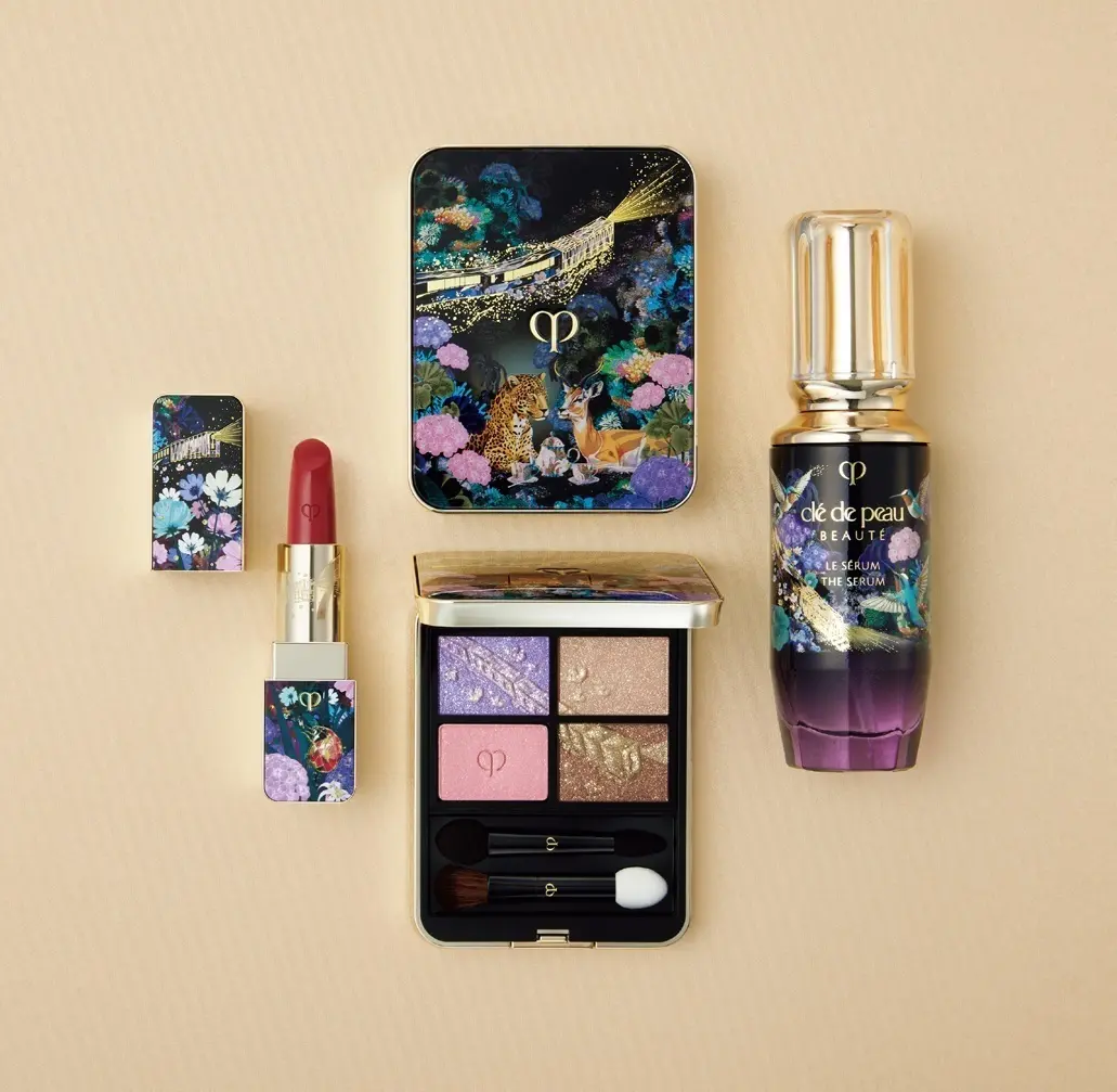 クレ・ド・ポー ボーテのホリデーコレクションは、パリ在住のアーティスト、ステファン・キエルとのコラボレーション。金色に輝く列車で夜空を旅する中、不思議な動物たちと出会うという、夢の世界を描いたもの。美容液に描かれたハチドリは、旺盛な好奇心やポジティブな姿勢を象徴。肌を健やかに保ち、若々しい印象へ導くル・セラムⅡのポテンシャルを想起させる。4色アイカラーのヒョウとアンテロープや、ルージュのてんとう虫にも意味があり、メイクがもたらす前向きな力を思わせる。冬の夜、クレ・ド・ポー ボーテのコスメで幻想的な夢の世界へ旅に出よう。