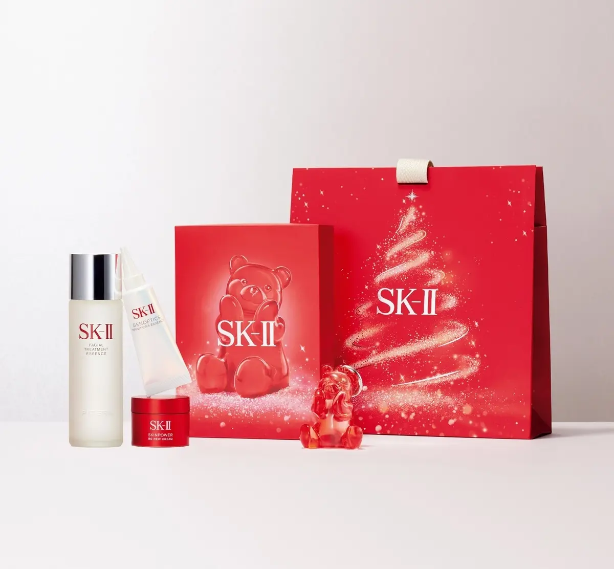 毎年人気を集めるSK-IIのホリデーコレクション。今季は、オリジナルキャラクター「ぴてくま」が、喜びに満ちあふれたクリアな素肌の世界へと誘う。「フェイシャルトリートメント エッセンス」現品サイズに、薬用美白*1美容液と美容クリームのミニサイズ、「ぴてくま」の可愛いチャームが付いたセットで、美しさのポテンシャルを引き出そう。