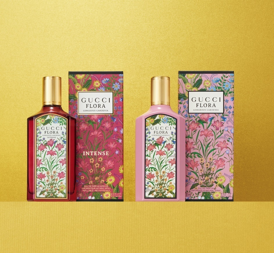 左から:グッチ フローラ ゴージャス ガーデニア オードパルファム インテンス 100㎖ 23,760円、グッチ フローラ ゴージャス ガーデニア オードパルファム 100㎖ 23,100円