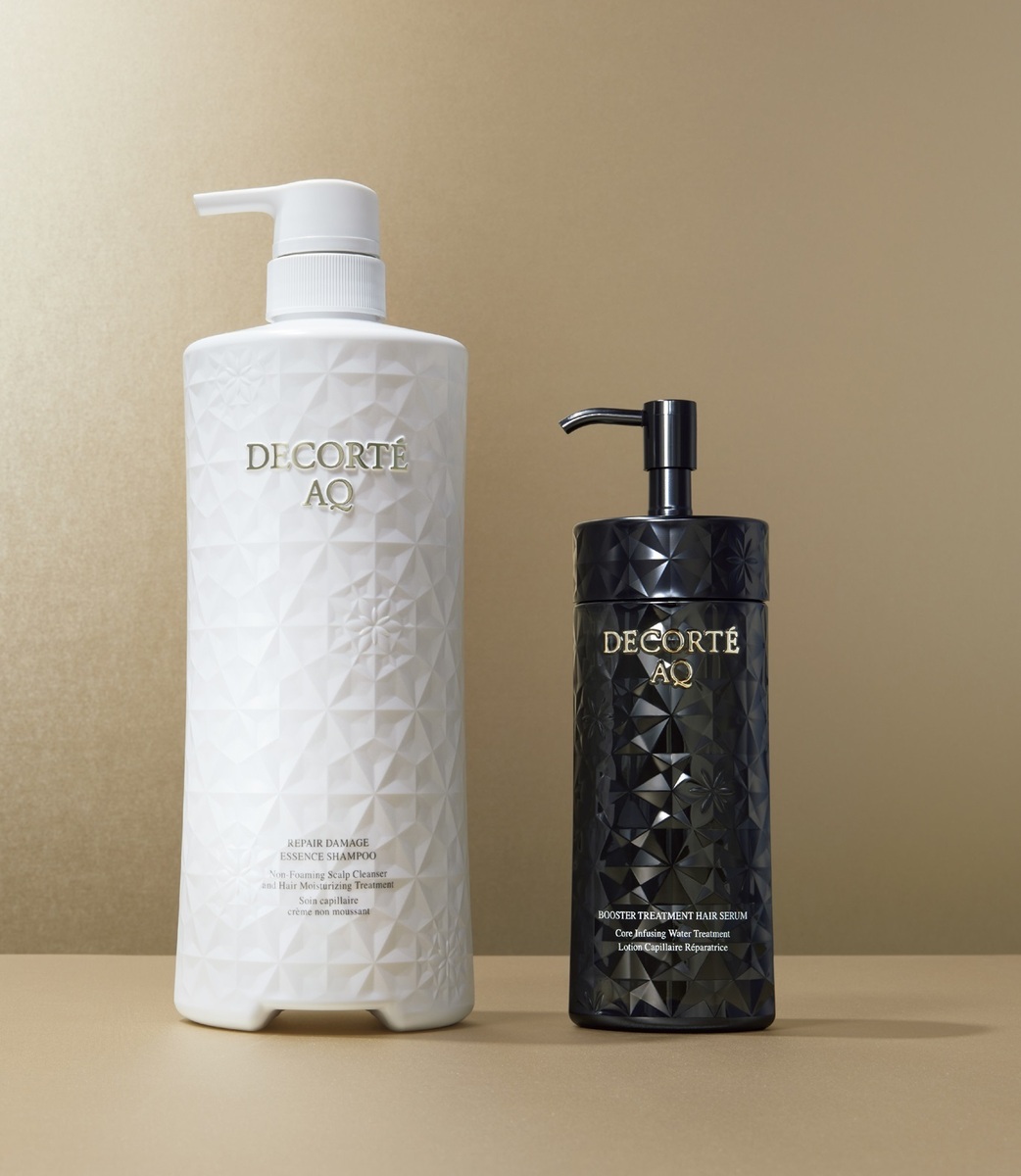 左から:コスメデコルテ AQ リペア エッセンスシャンプー 800g 11,000円(10月16日(木)発売)、コスメデコルテ AQ ブースティング トリートメント ヘアセラム 200㎖ 5,830円