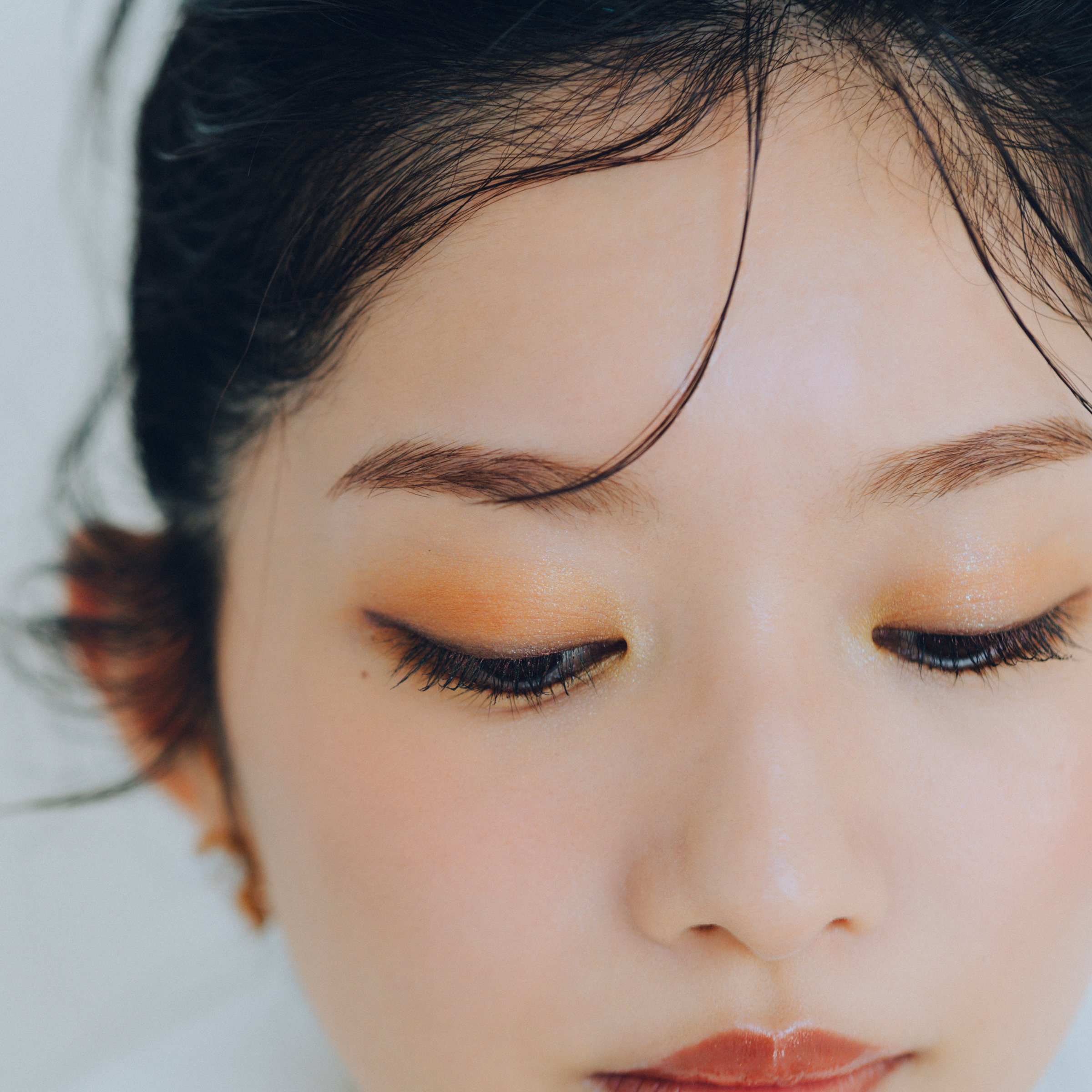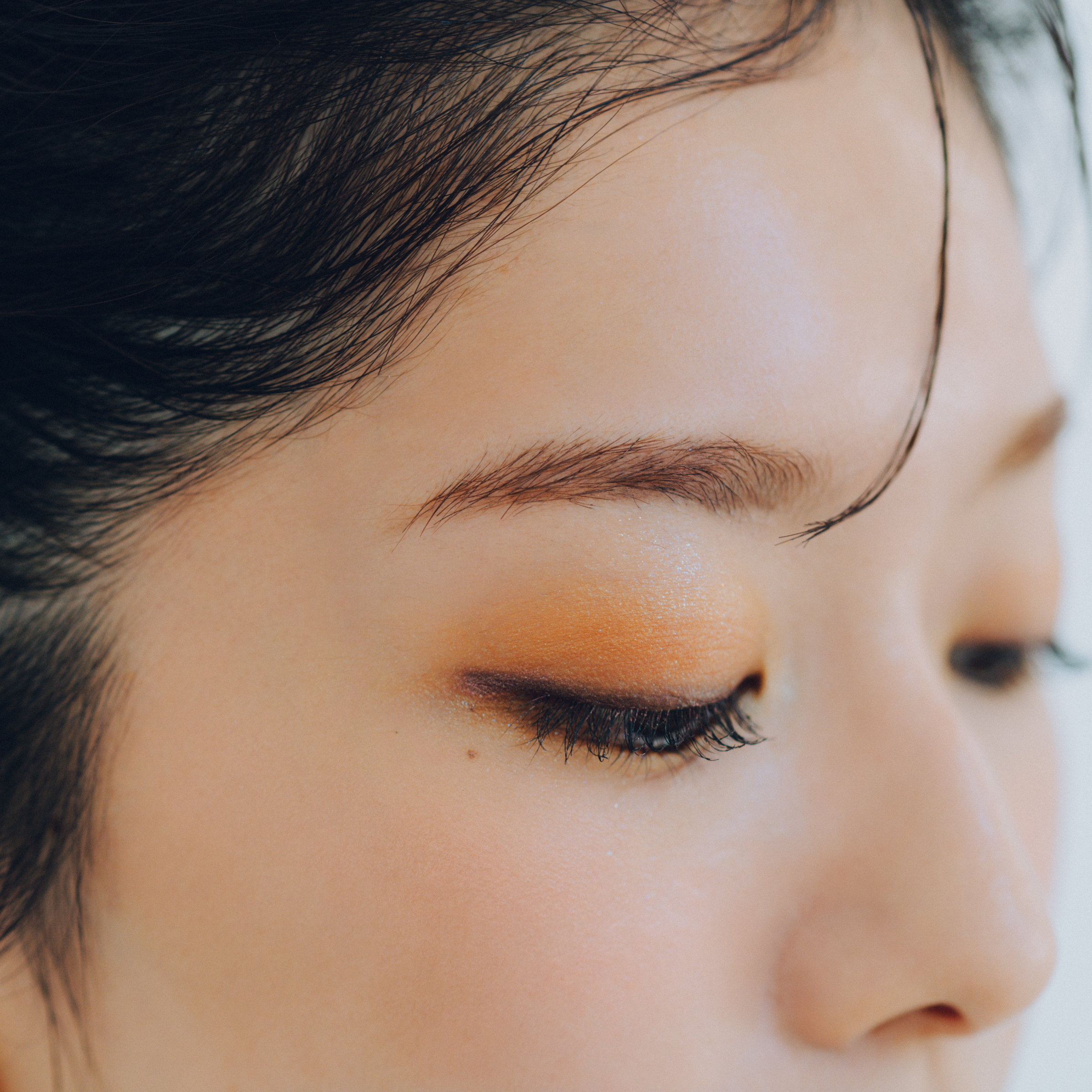 RMK ブリーズ ブリス エスケープ アイズ & ブラッシュ パレットのアイシャドウの右下マスタードカラーをブラシに取り、アイホール全体と下まぶたに塗る。右上ライムグリーンを上まぶたの目頭と下まぶた全体に重ねる。左下ブラックブラウンをアイラインのようにまぶたの際にのせる。左上シアーブロンズを指に取り、まぶたの中央と目頭に重ねる。