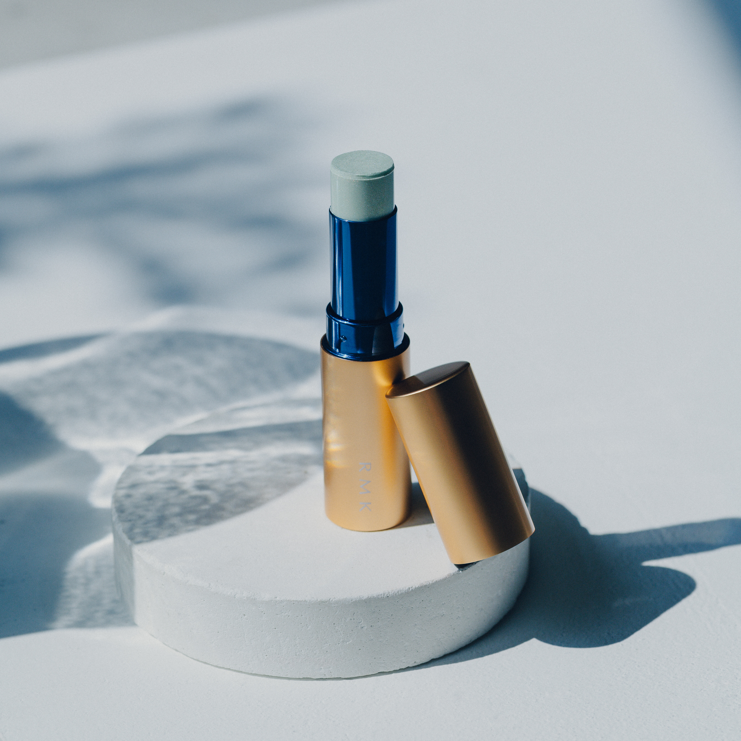 RMK ラディアントカラースティックを頬の高いところに塗り、指で自然になじませる。