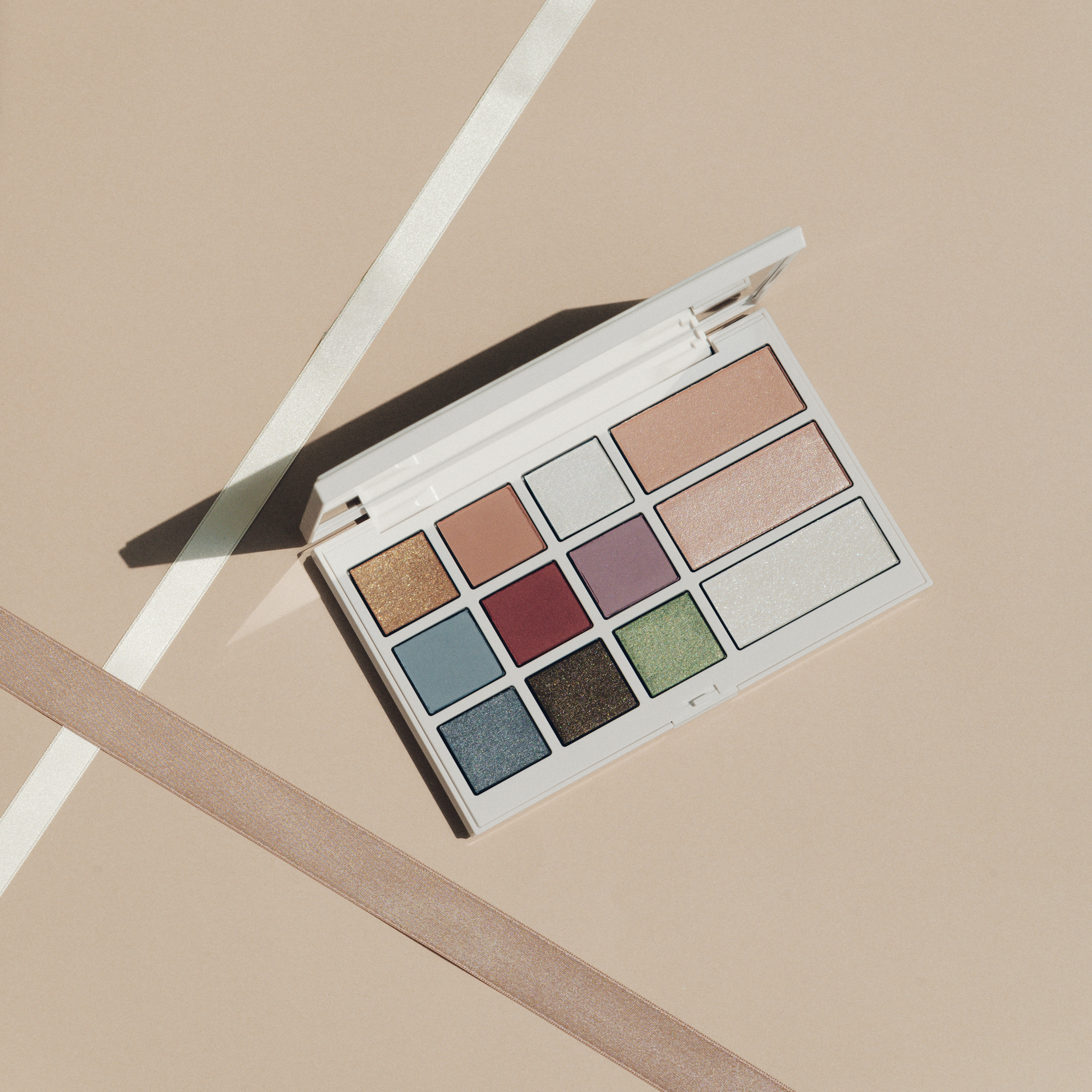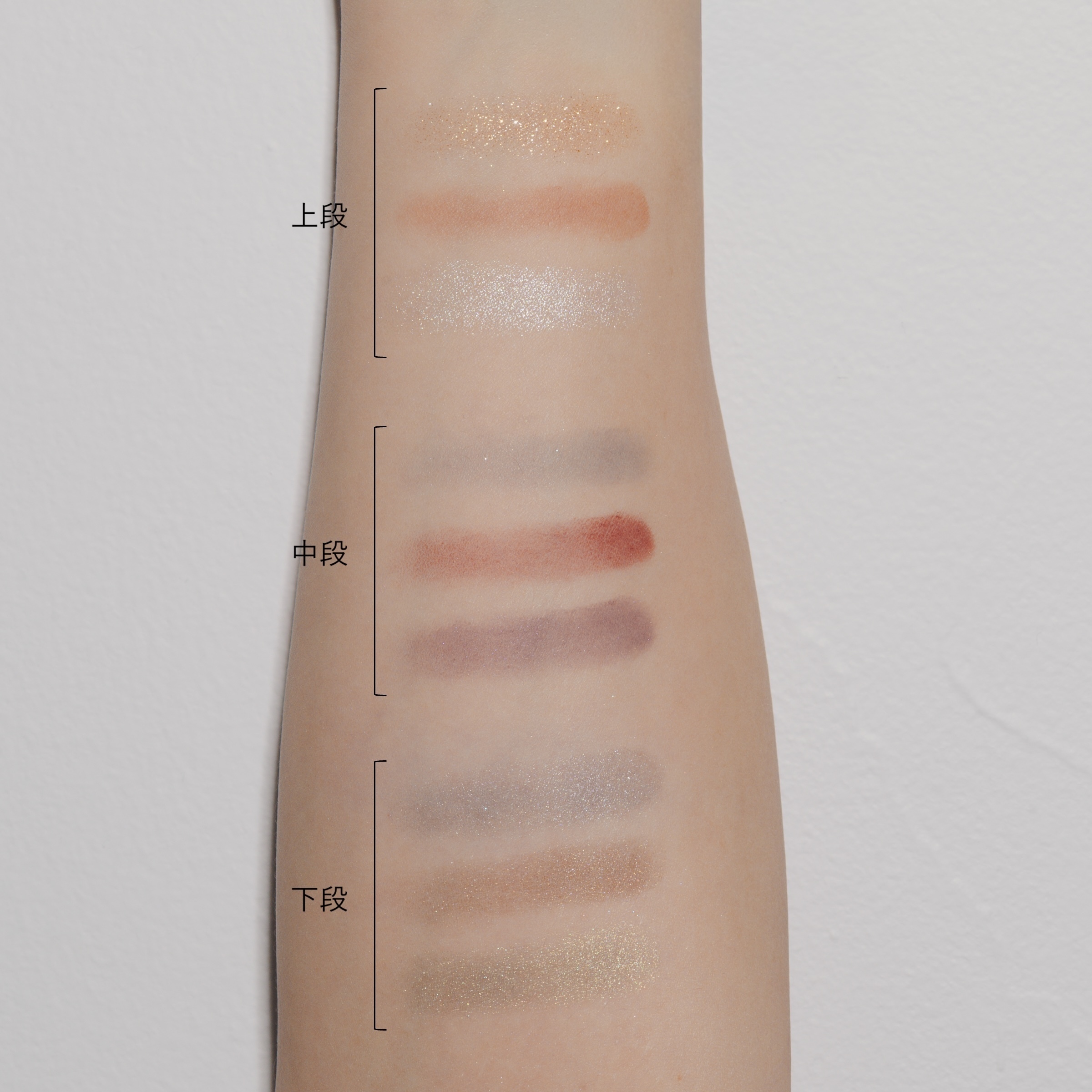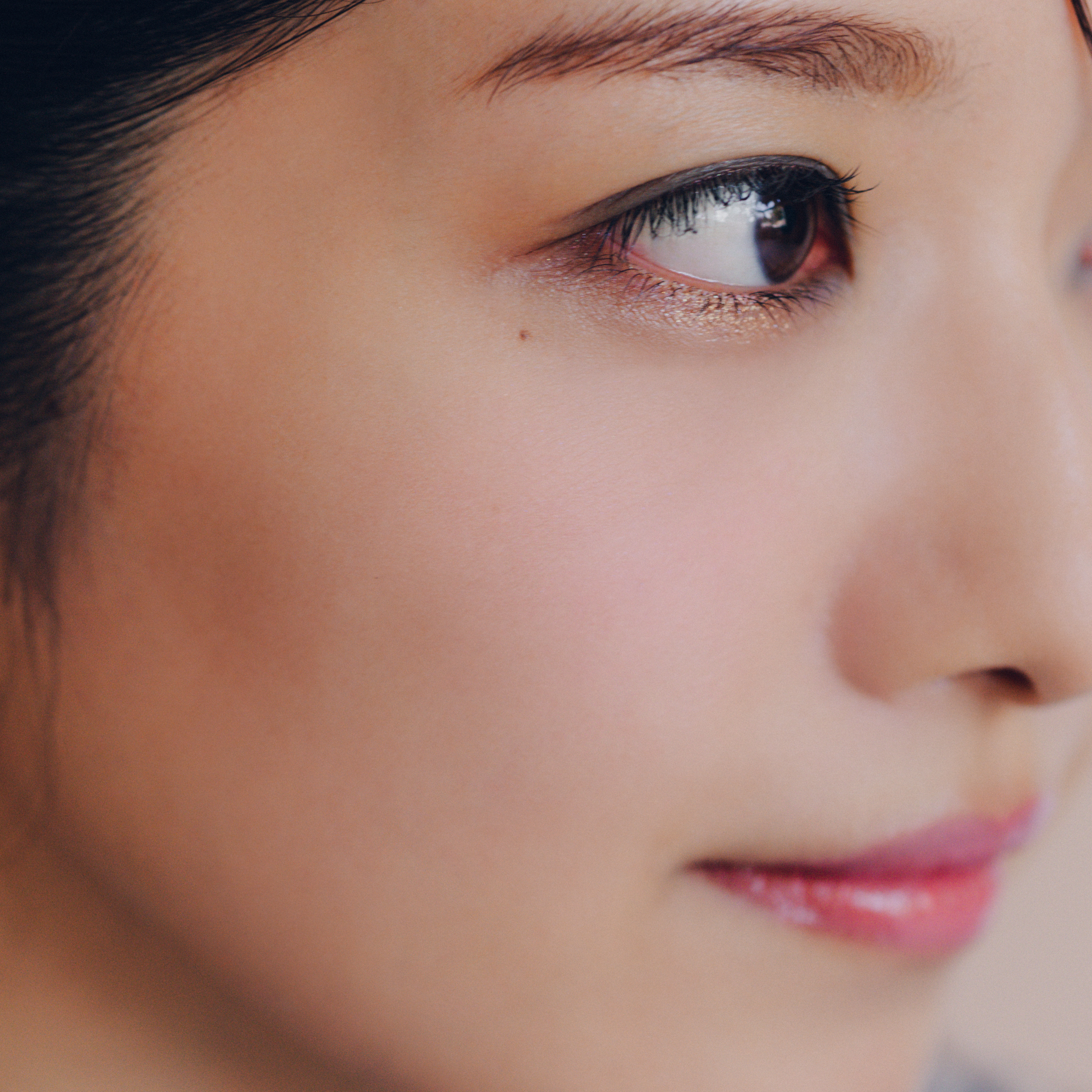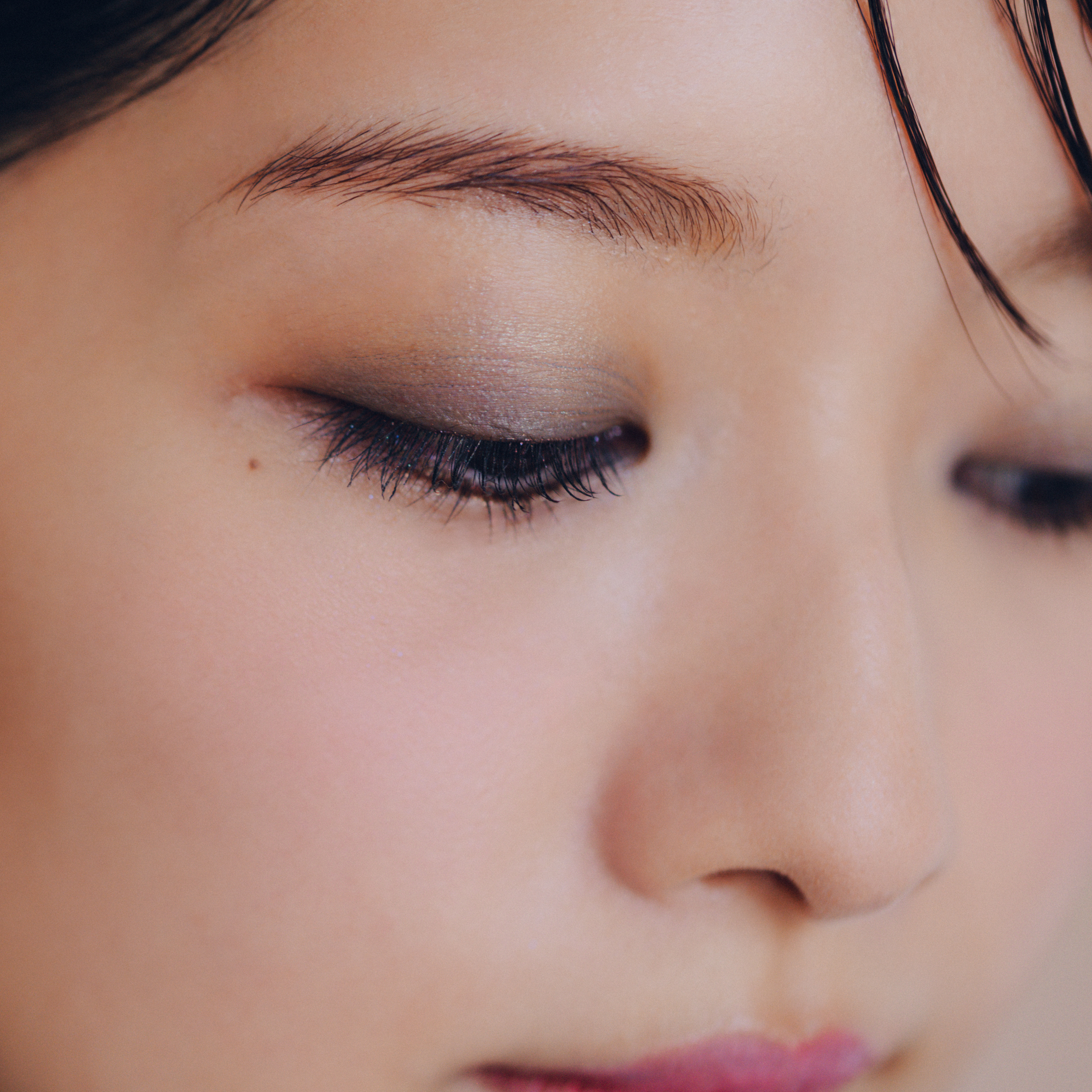 アディクション アイ & ブラッシュ パレット “アンアースド ラスター”のアイカラー・中段左の色をブラシに取り、上まぶたの二重幅と目頭にのせる。上段左の色をブラシに取り、下まぶたの黒目下に入れる。下段中央の色をブラシに取り、二重幅の位置にふわりと重ねる。