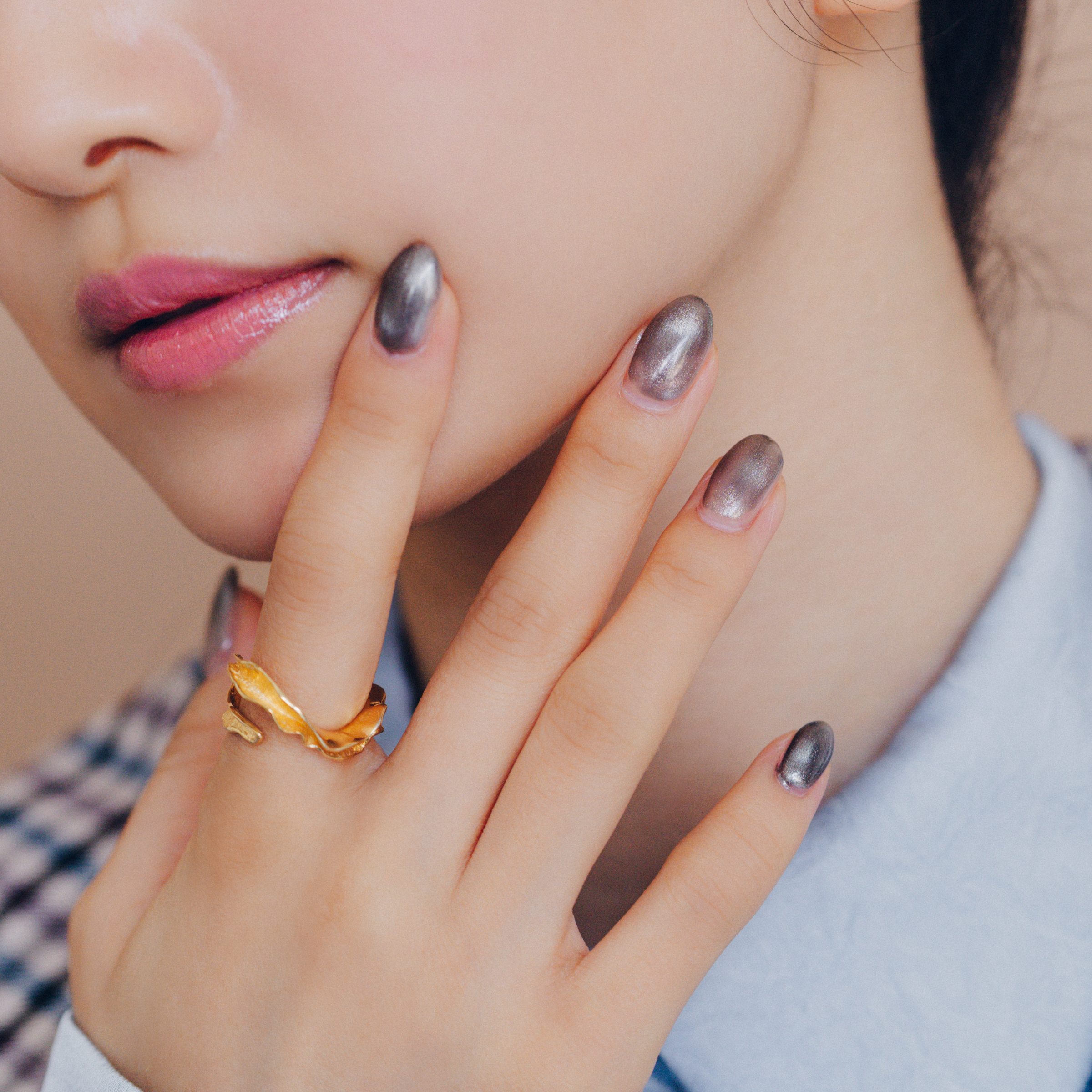 流動性の高いベースにマグネットを近づけることで、自分だけのデザインが生まれるマグネットネイル。限定色は揺らぎを感じさせるゴールデンベージュの101MG、静かな光を放つチャコールブルーの102MG、ゴールドを帯びたブラックの103MG(モデル使用色)の3色がラインアップ。マグネットの当て方によってさまざまな仕上がりになるので、同じカラーを塗ってもその都度、異なる表情が楽しめます。