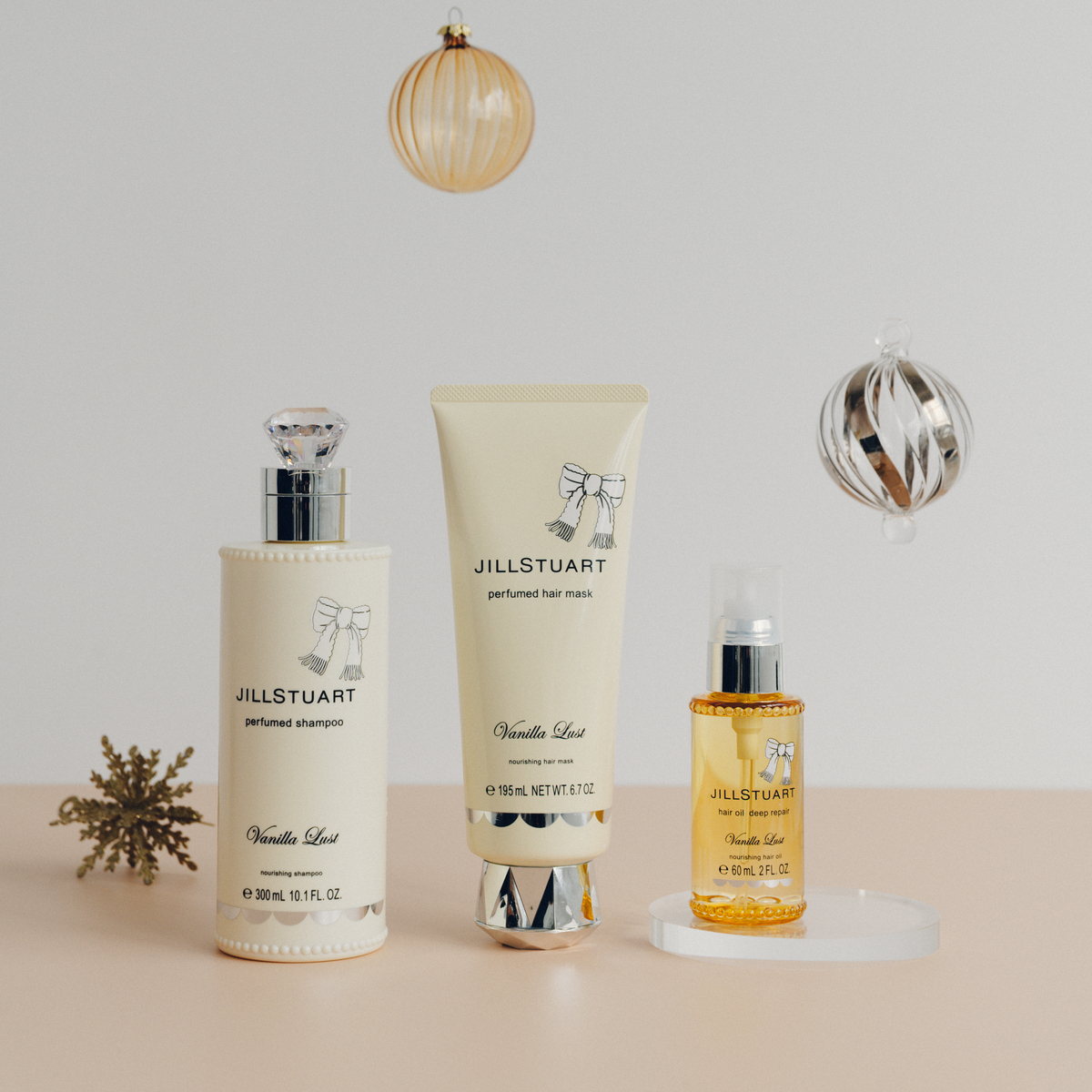ヴァニラ ラスト シリーズからは限定のヘアアイテムもお目見え。濃密な泡で頭皮と髪の汚れを包み込み、滑らかに洗いあげるシャンプー、週に1〜2度のスペシャルケアに取り入れたいヘアマスク、毛髪を柔軟にする成分※を配合し、まとまりのよいツヤ髪に整えるオイルの3品。マフラーを外したとき、なびく髪からふわっと漂う甘い香りをお楽しみください。