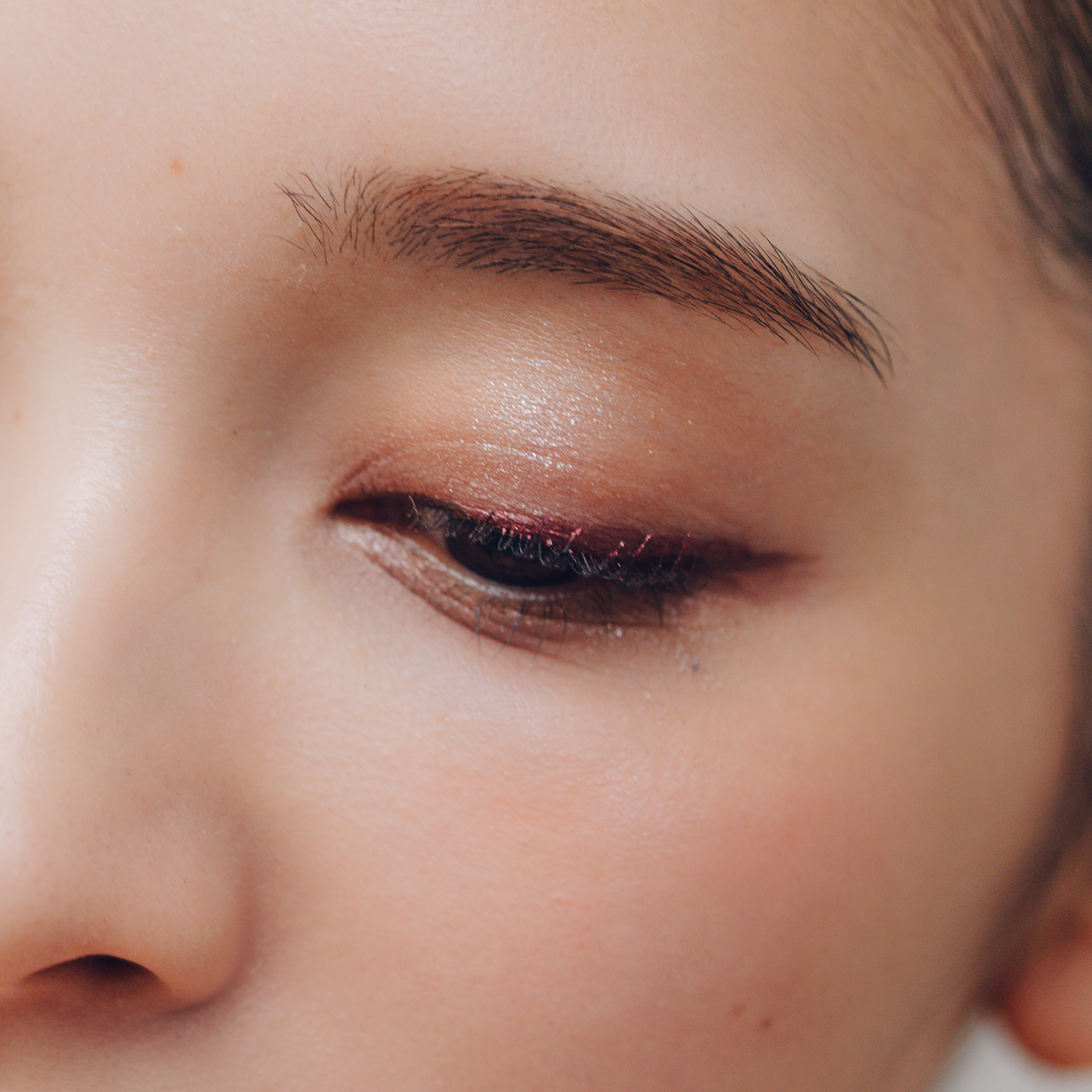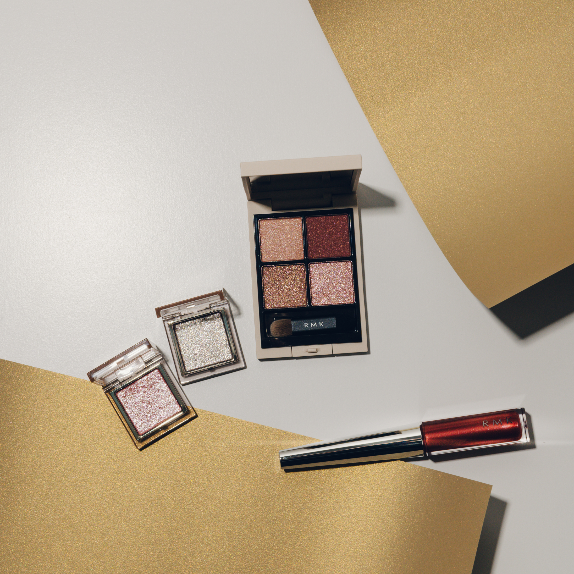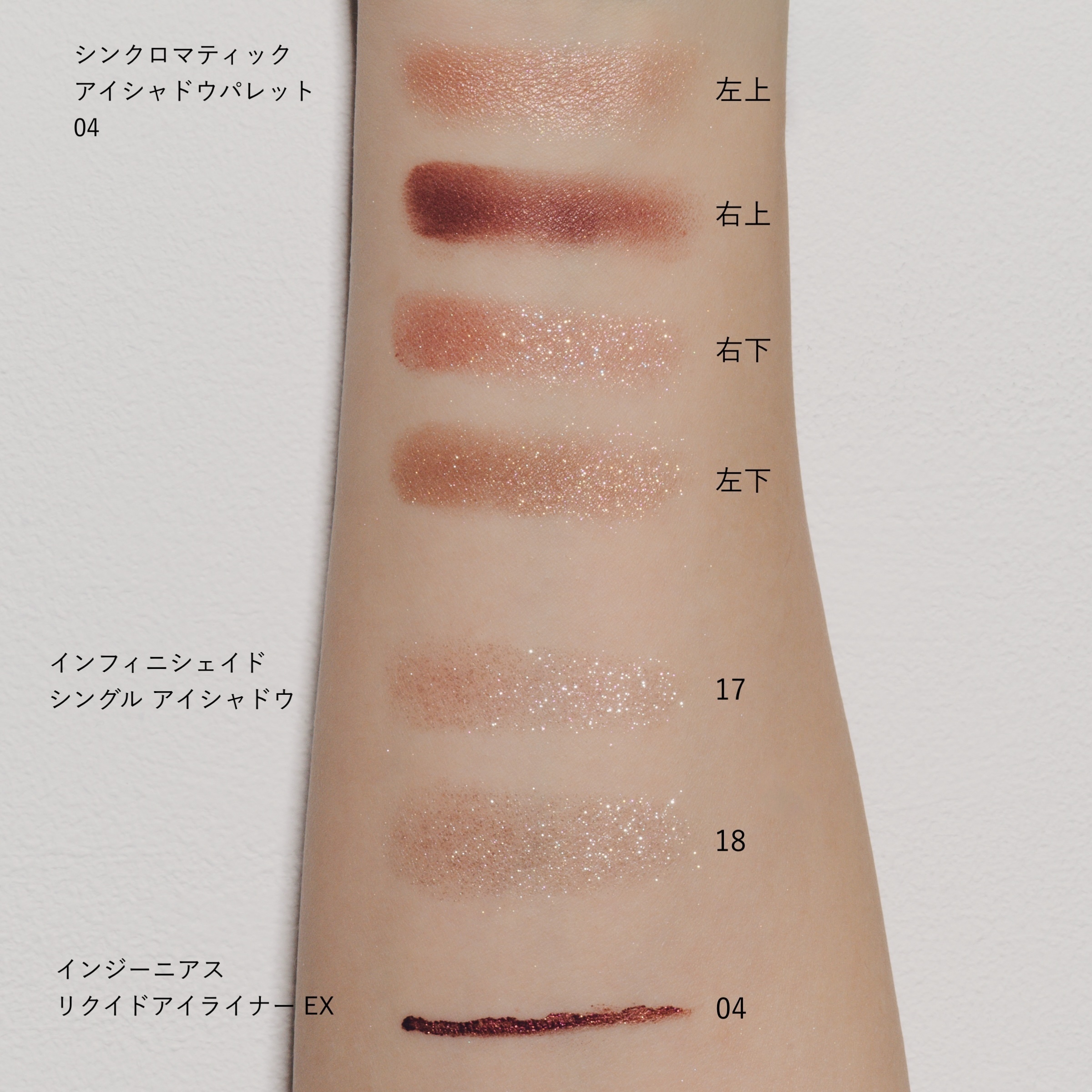 RMK シンクロマティック アイシャドウパレット 04の左上をブラシに取り、アイホール全体と下まぶたの涙袋にのせたら、左下をブラシに取り、二重幅になじませる。右上をチップに取り上まぶたの際にラインのように入れたら、左下を下まぶた際の黒目外側から目尻までラインのように入れる。RMK インジーニアス リクイドアイライナー EX 04で黒目外側から上まぶたに沿ってラインを入れる。目尻はややオーバー気味にシュッと引いて目元を強調する。最後にRMK インフィニシェイド シングル アイシャドウ 18を指に取り、上まぶたの黒目の上にトントンと広がらないように重ねる。