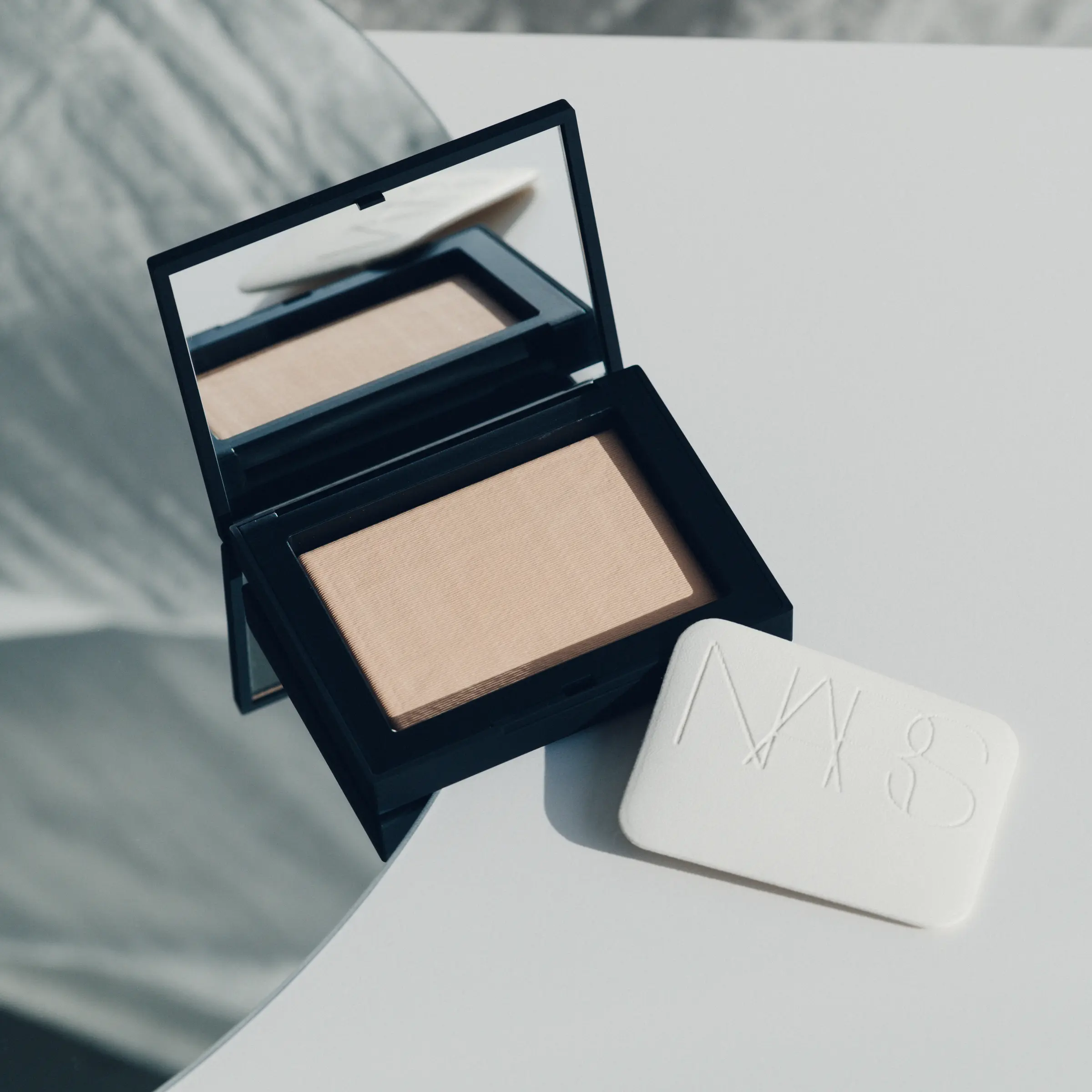 シュウウエムラ アンリミテッド ブロック:ブースター アドバンスト ルミ ブルーを薄く塗り広げる。NARS ライトリフレクティングセッティングパウダー プレスト N 05555を大きめのブラシに取り、全体にふわっとのせる。