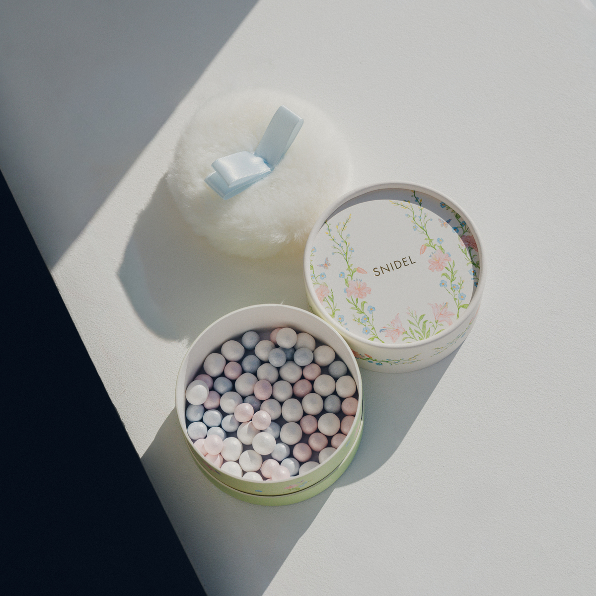 ピュアホワイト、ラディアンスピンク、サムシングピュアブルー。キュートな3色のパールボールから成るボディーパウダーは、ブランド誕生5周年を記念した限定コレクションから。肌の凹凸や毛穴をふんわりとぼかして滑らかに補正し、繊細な煌めきを与えます。アルガンオイル※1、ザクロ花エキス、ホホバオイル※2など植物由来成分を配合し、保湿効果も。スナイデル ビューティで人気のオードトワレ・noon moonの香り。