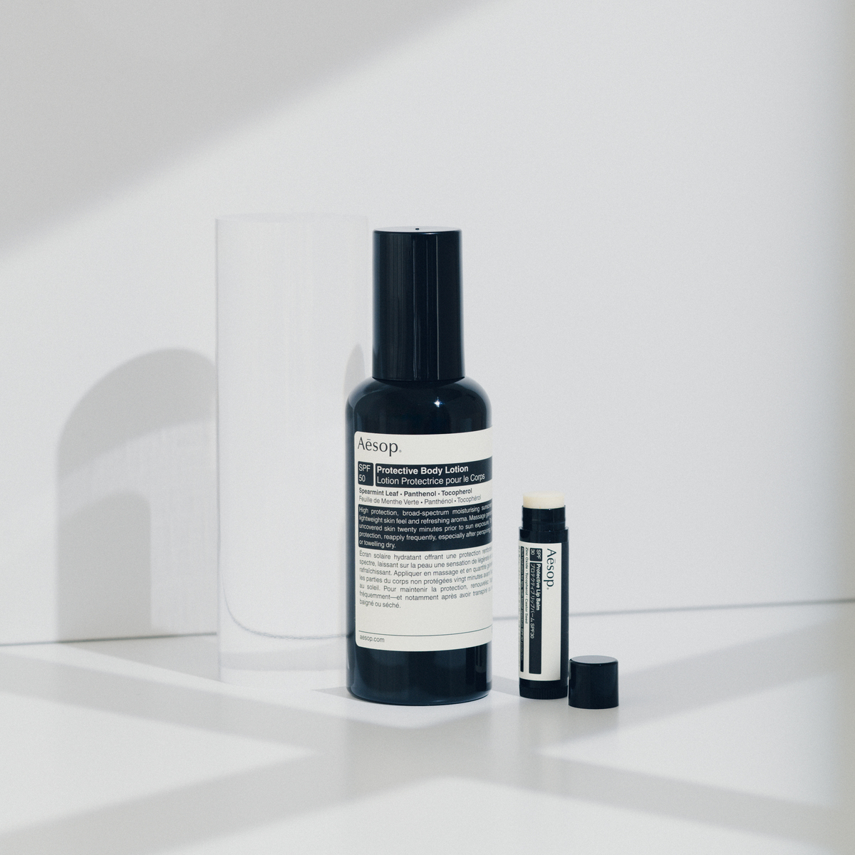 イソップで人気のサンケアは今からすぐに活躍しそうな、さっとなじんで滑らかマットなボディーに仕上げる日焼け止めローション。塗ったそばから素早くなじみ、天然ミネラルの一種シリカが余分な皮脂を吸収するので、なじませた後はサラサラに。さらに、大きな魅力がその香り!スペアミント、ラベンダー、レモンのエッセンシャルオイルが気分まで軽やかに。無防備な唇を紫外線から守り潤いを与えるリップバームもおすすめ。