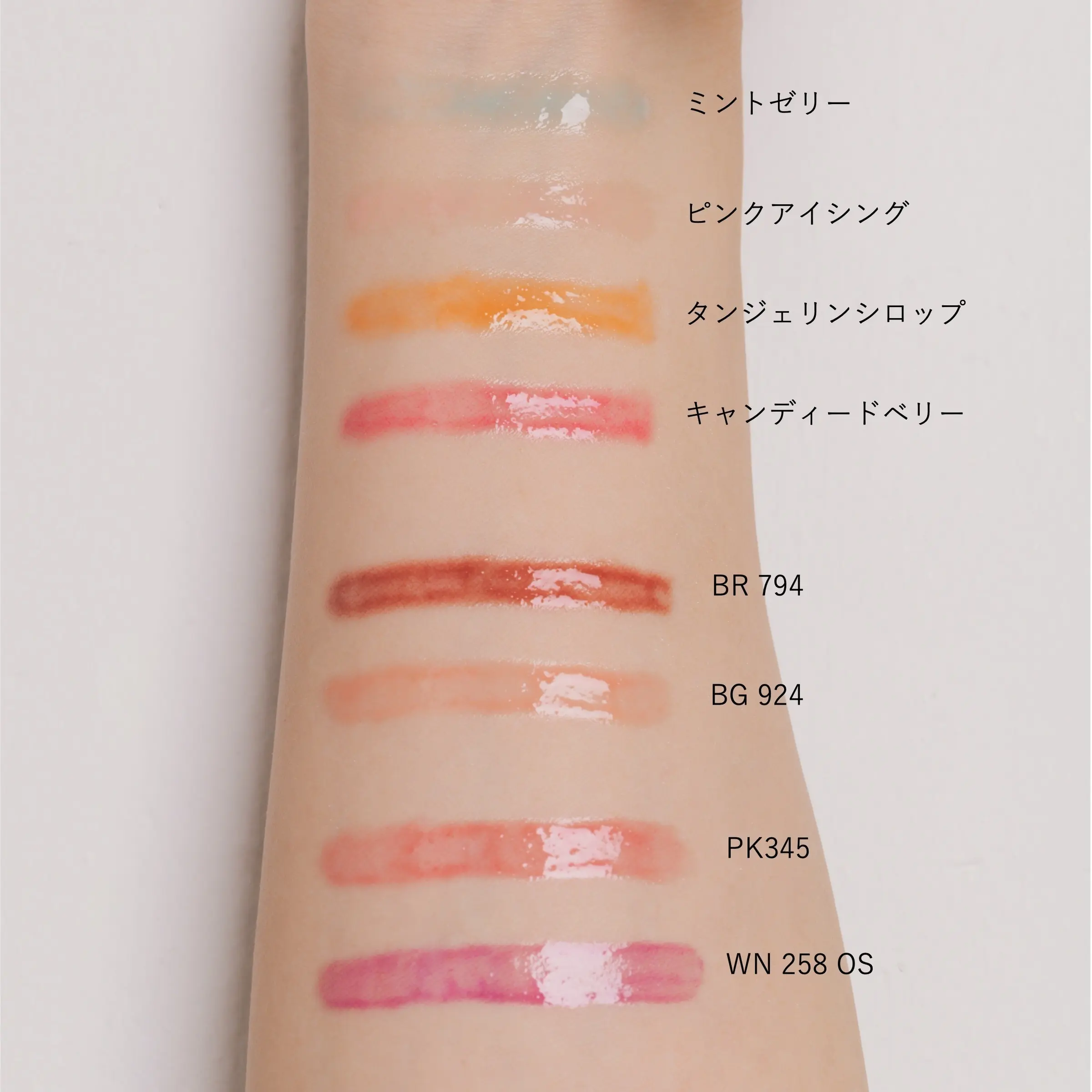 ミントゼリー、ピンクアイシング、タンジェリンシロップ(限定色・モデル使用色)、キャンディードベリー、BG 924、BR 794、PK 345、WN 258(限定色)
