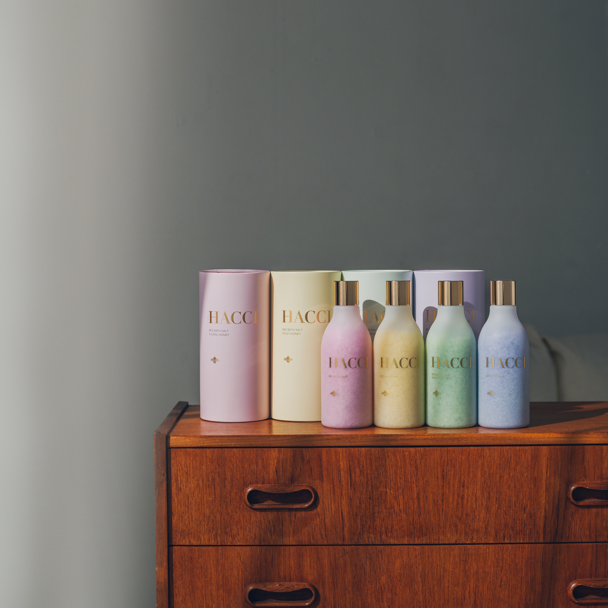 カラフルなバスソルトは、国産海塩※1やハチミツパウダー※2、ロイヤルゼリー※3などの保湿成分を配合。香りに包まれながら気分までリフレッシュ、ミルキーカラーのお湯でバスタイムをやさしく彩ります。ピンクはハリ弾力、イエローは角質ケア、グリーンは肌荒れ※4防止、パープルは保湿をそれぞれサポート。